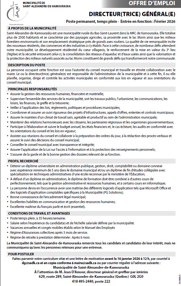 Municipalité - Offre d'emploi direction général